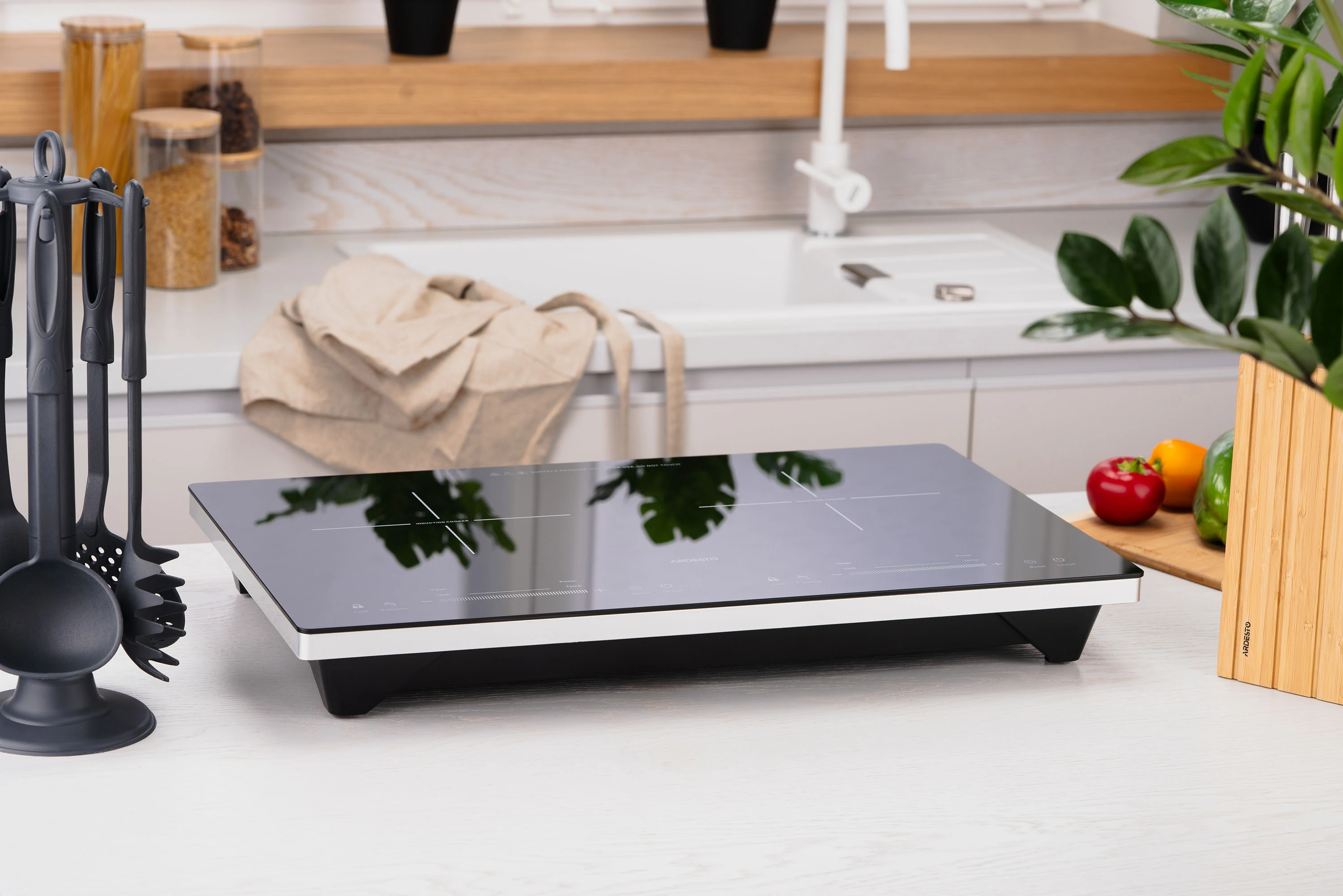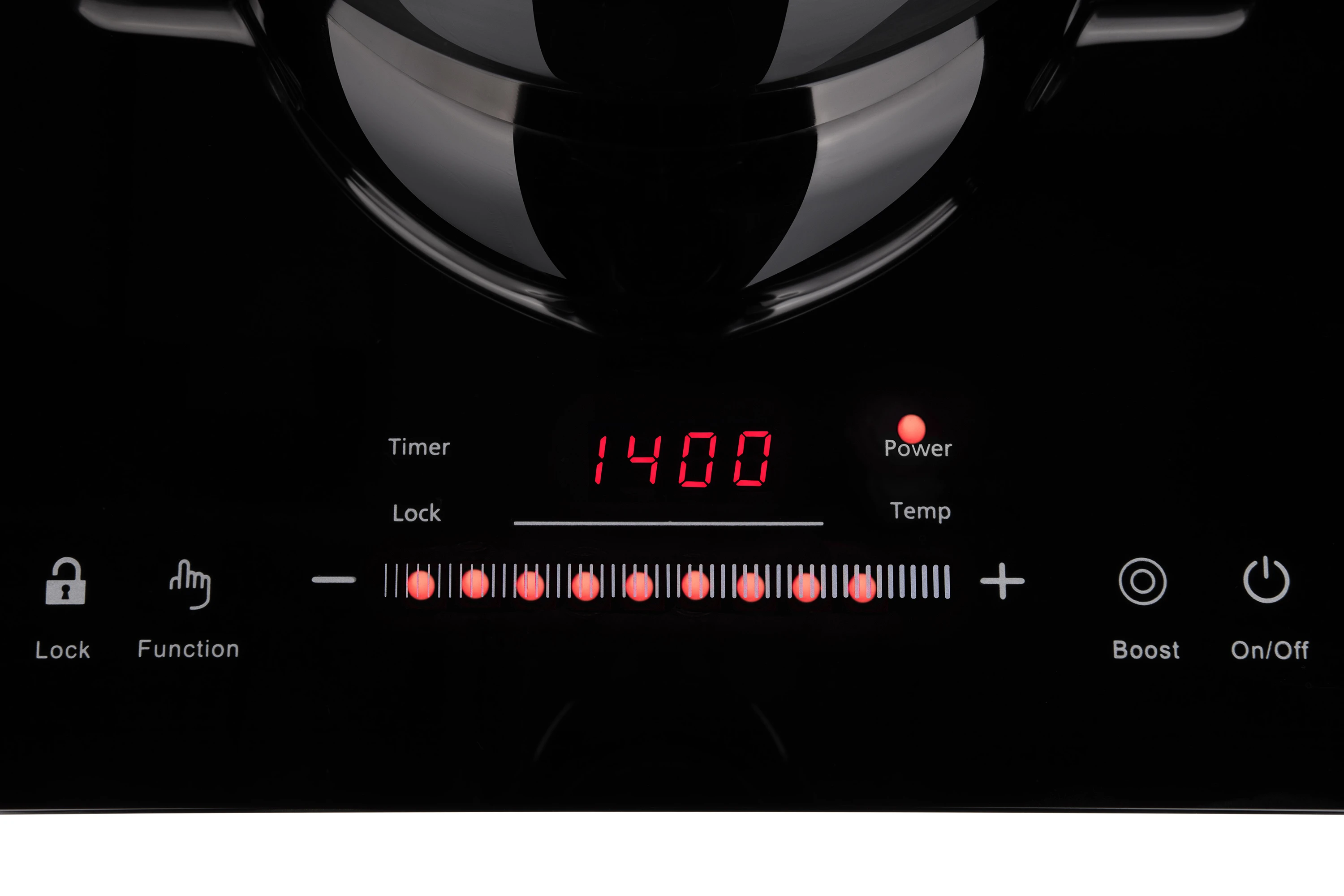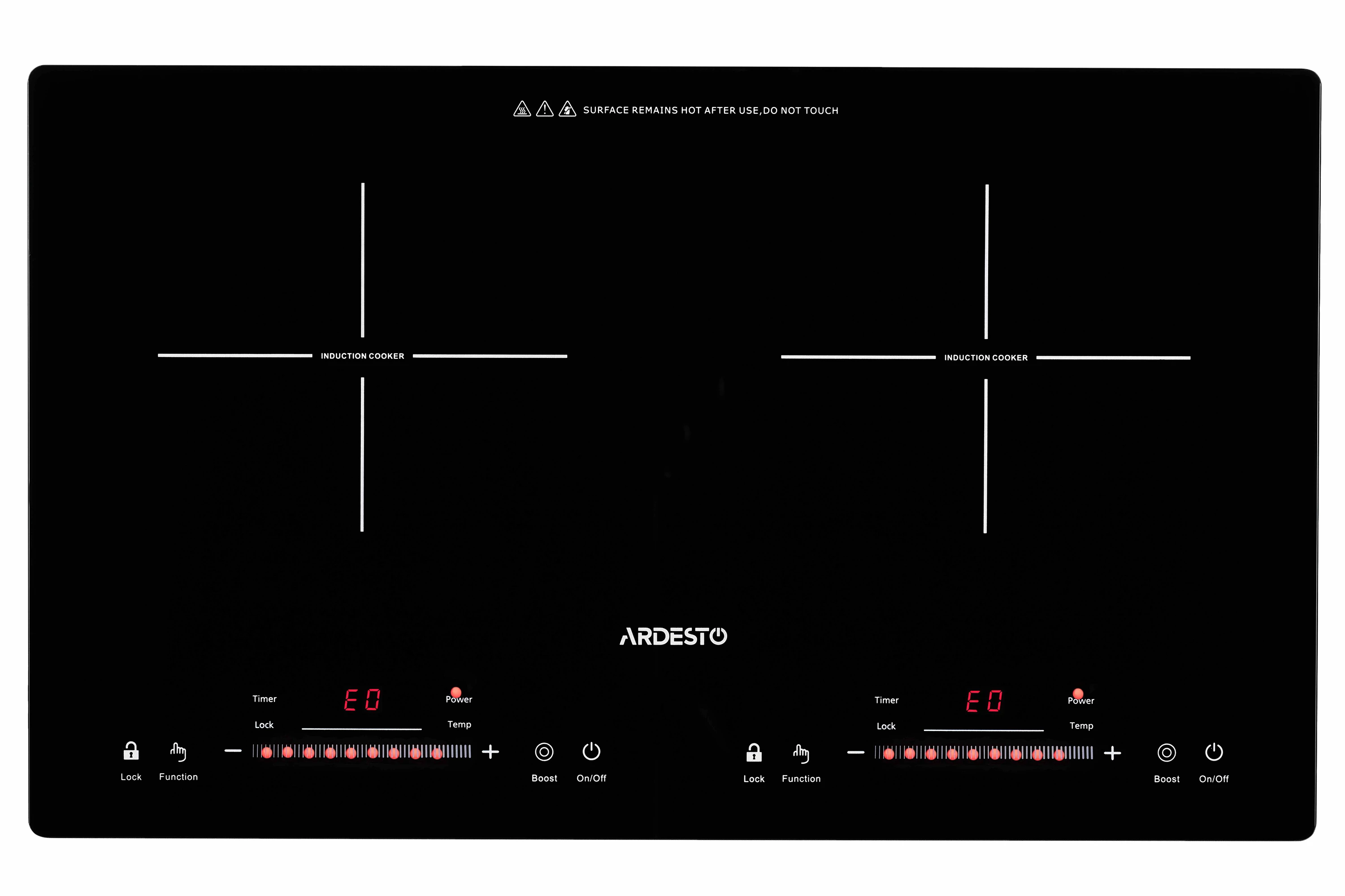 Індукційна електрична варильна поверхня на дві конфорки з загальною потужністю 3100 Вт, сенсорним управлінням, регулюванням температури та потужності, режимом Boost, а також таймером приготування, блокуванням панелі та захистом від перегріву і перепадів напруги.