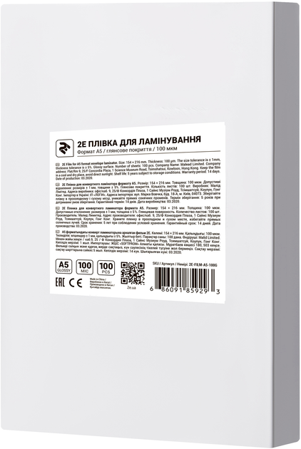 Плівка для ламінування A5 2E, глянсове покриття, 100 мкм, 100шт
