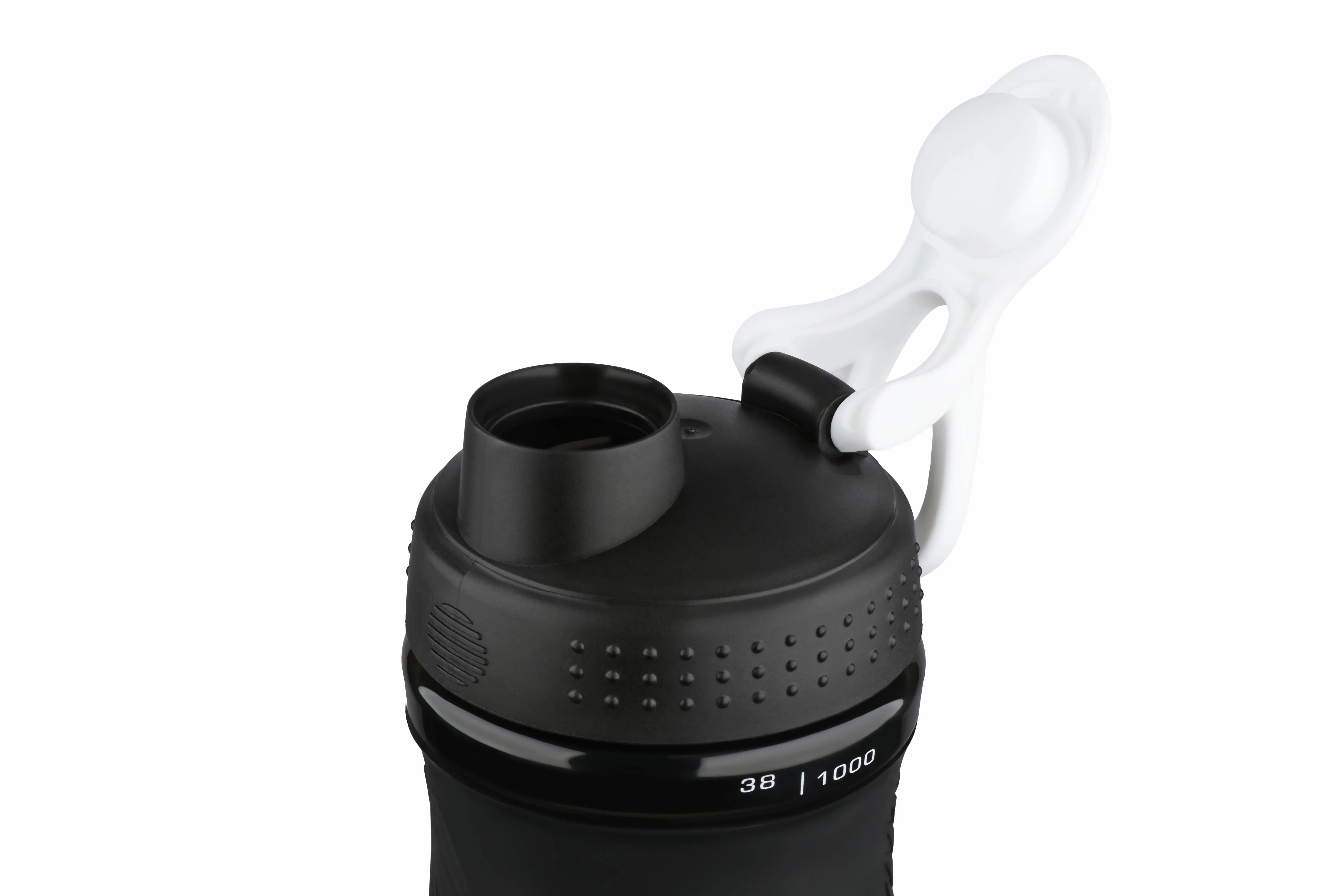 Пляшка для води на 1 л з кришкою, клапаном для пиття, прогумованою вставкою та ручкою. Для зручності на прозорій колбі є мірна шкала.