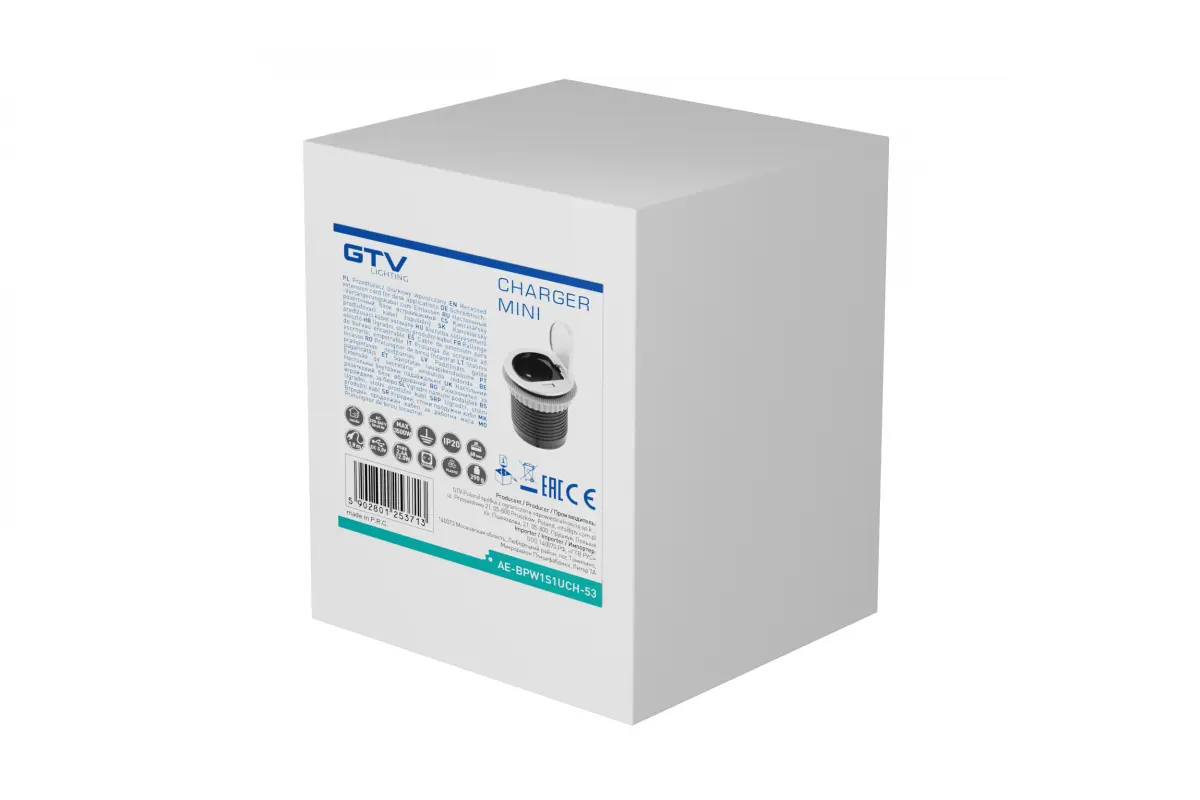 Удлинитель GTV CHARGER MINI врезной 60мм 1x розетка Schuko 1xUSB 2,4A кабель 1,9м, Алюминий