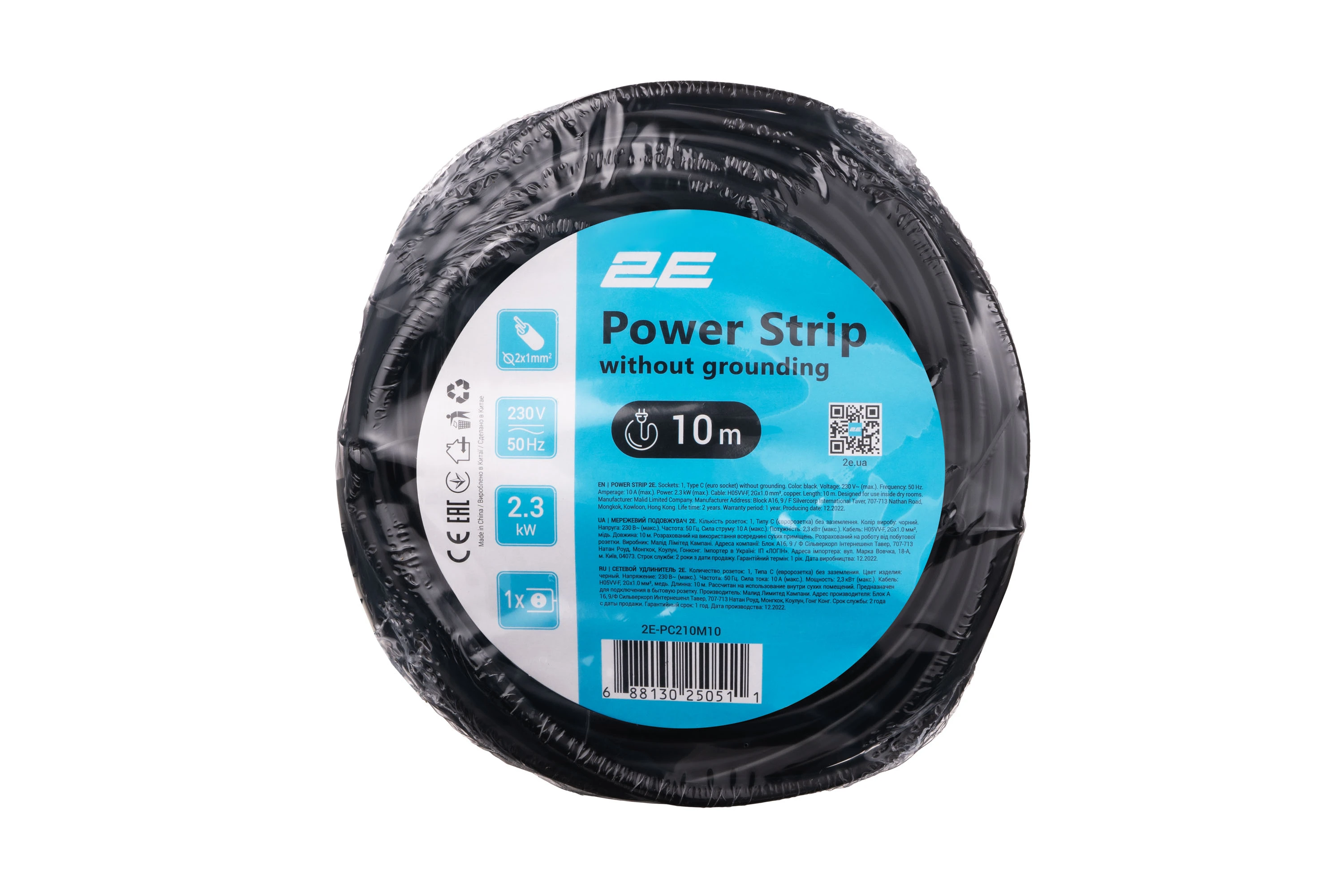 Мережевий подовжувач 2E модель PC210M10 призначений для підключення офісної та побутової техніки сумарною потужністю до 2,5 кВт. Має одну розетку типу CEE7/17 без заземлення (євророзетка/євровилка), двожильний кабель із перерізом жили 1 мм², матеріал провідника – мідь. Чорного кольору, довжина кабелю 10 м.