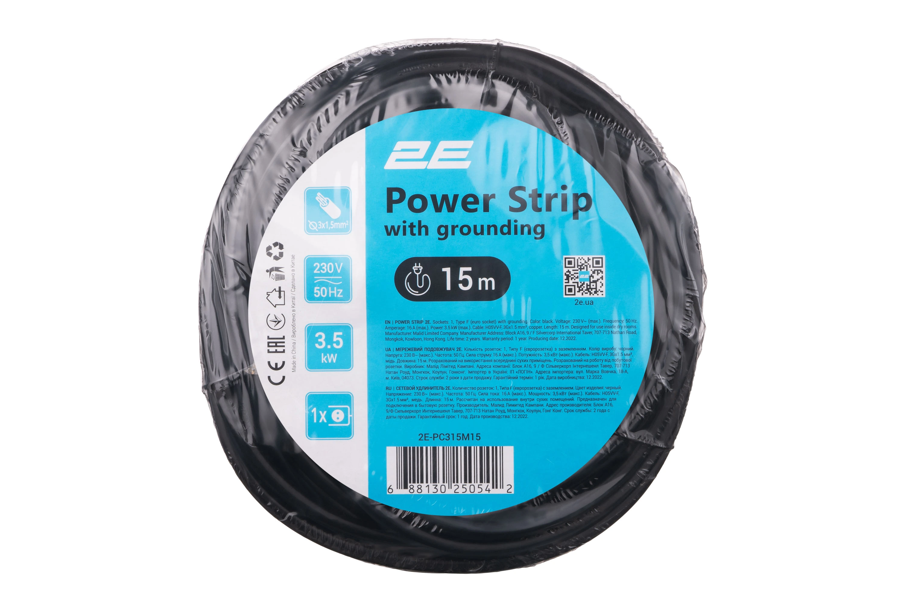 Мережевий подовжувач 2E модель PC315M15 призначений для підключення офісної та побутової техніки сумарною потужністю до 3,5 кВт. Має одну євророзетку типу Schuko із заземленням. Трижильний кабель із перерізом жили 1,5 мм², матеріал провідника – мідь. Чорного кольору, довжина кабелю 15 м.