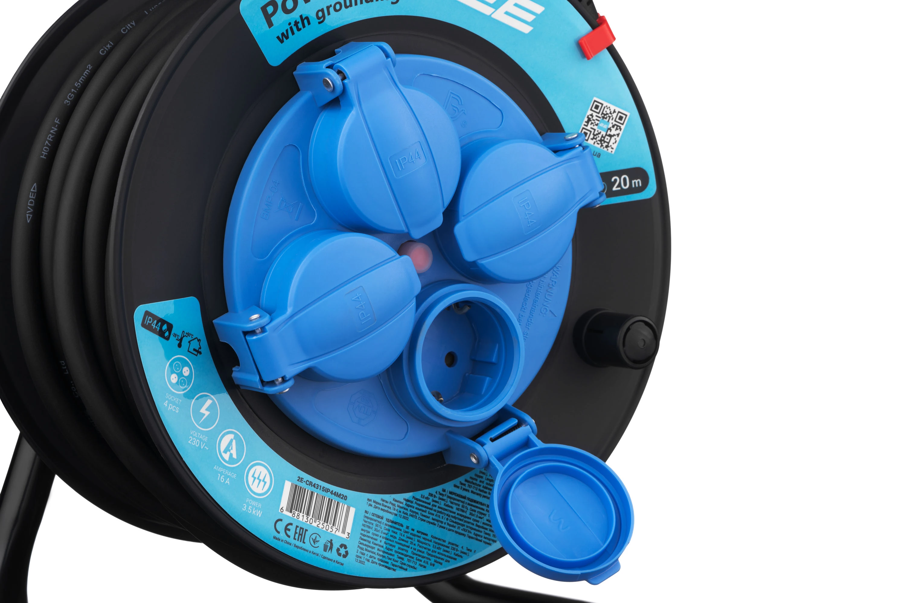 Подовжувач мережевий 2E 4хТип F, 3х1.5мм кв, 16A, на котушці, 20м, чорно-синій