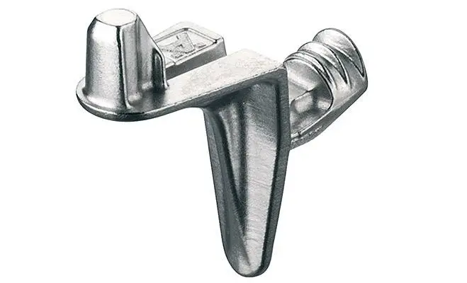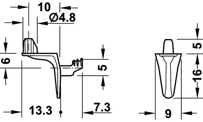 Полицетримач для дерев'яних полиць для кріплення в отворі діаметром 5 мм. Витримує навантаження до 15,6 кг.