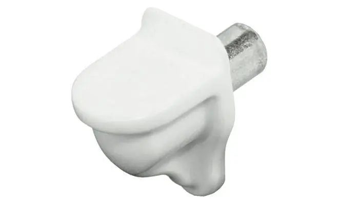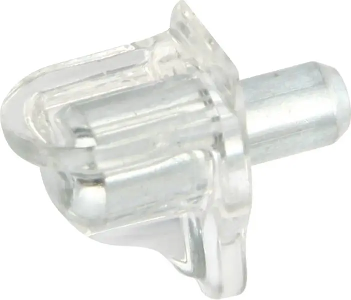 Полицетримач для дерев'яних і скляних полиць, матеріал: пластмаса зі сталевим штифтом, колір: прозорий/оцинкований, для сверлового отвору діаметром 5 мм, максимальне навантаження 80 кг.