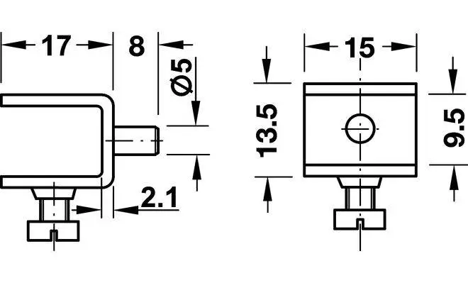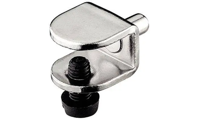 Полицетримач для скла, з фіксуючим гвинтом в якості стопора для полиці, матеріал: сталь/пластмаса, колір: нікельований/чорний, для скла товщиною 9 мм, для вставляння в отвір діаметром 5 мм.