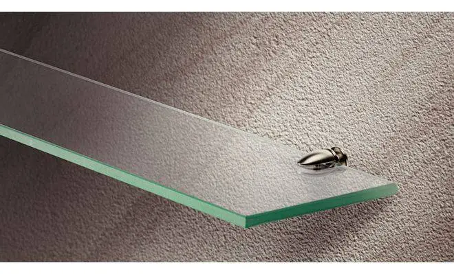 Дизайн-затискний полицетримач для дерева і скла, матеріал: цинкове лиття, хромований, полірований, розмір: 18x25x18 мм, для полиць товщиною 5-7 мм, для вкручування в отвір діаметром 4 мм.