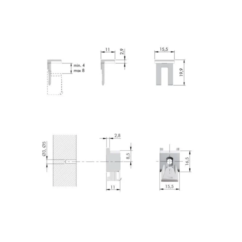 - Толщина стекла: Подходит для стеклянных полок толщиной от 4 до 8 мм, что позволяет использовать этот полкодержатель для широкого спектра стеклянных элементов.