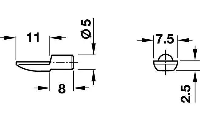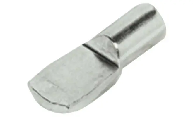 Полицетримач для дерев'яних полиць, у формі лопатки, матеріал: сталь, нікельований, для вставляння у отвір діаметром 5 мм, максимальне навантаження 80 кг.