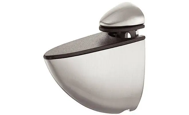 Дизайн-затискний полицетримач для дерева і скла, матеріал: цинкове лиття, кольору нержавіючої сталі, розмір: 26 x54 x47 мм, для полиць товщиною 4–18 мм, для вкручування в отвір діаметром 4 мм.
