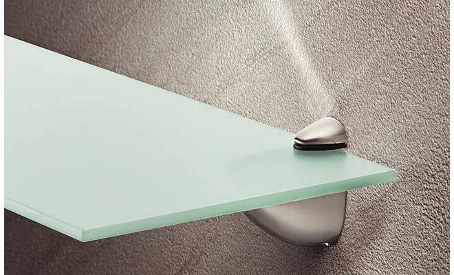 Дизайн-затискний полицетримач для дерева і скла, матеріал: цинкове лиття, хромований, полірованийі, розмір: 25x69x48 мм, для полиць товщиною 4–23 мм, для вкручування в отвір діаметром 4 мм.