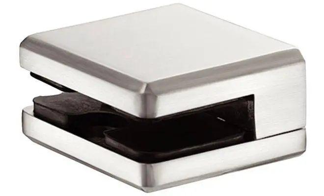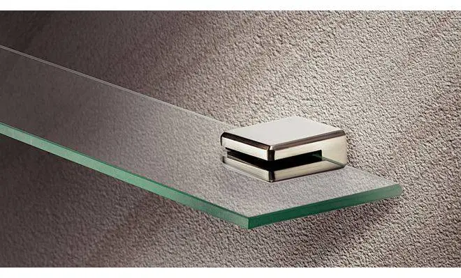 Дизайн-затискний полицетримач для дерева і скла, матеріал: цинкове лиття, хромований, полірований, розмір: 45 x47,5 x24 мм, для полиць товщиною 8 мм, для вкручування в отвір діаметром 5 мм.