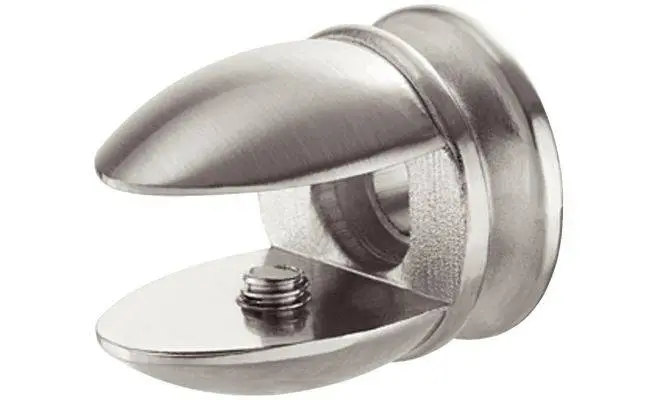 Дизайн-затискний полицетримач для дерева і скла, матеріал: цинкове лиття, колір: білий алюміній, RAL 9006, розмір: 18x25x18 мм, для полиць товщиною 5-7 мм, для вкручування в отвір діаметром 4 мм.