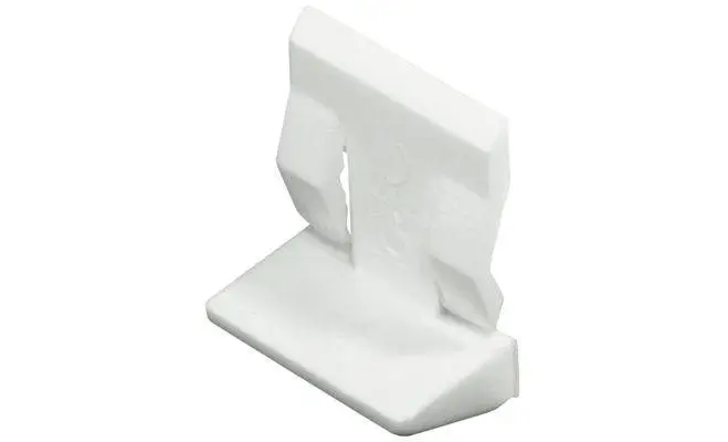 Полицетримач для скла, з затискним стопором, матеріал: пластик, колір: білий, для вставляння в свердловий отвір діаметром 5 мм, максимальне навантаженя 80 кг.