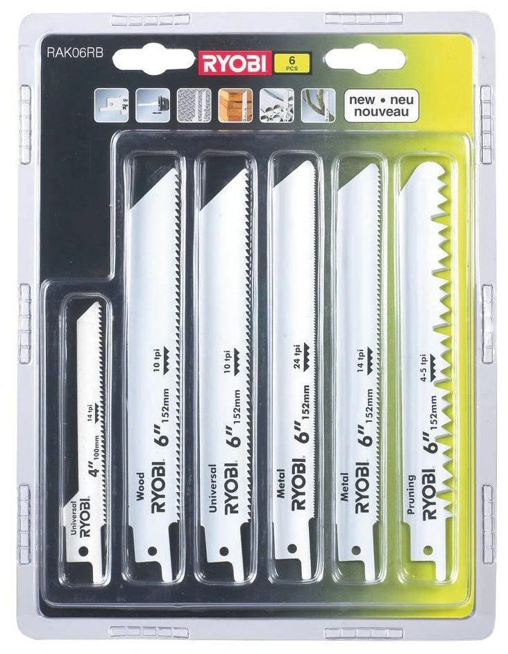 Полотно для шабельної пили Ryobi RAK06RB 5132002547 набір 6 шт, для дерева та металу. Набір ножів Ryobi RAK06RB із 5 предметів складається з різноманітних високоякісних полотен, які ідеально підходять для різання дерева, гіпсокартону, пластику, фанери та металу як вдома, так і на професійних майданчиках. Набір складається з шести ріжучих лез із загартованої нержавіючої сталі. Леза в наборі мають різну форму і призначення, всі універсальні для всіх марок шабельних пилок.