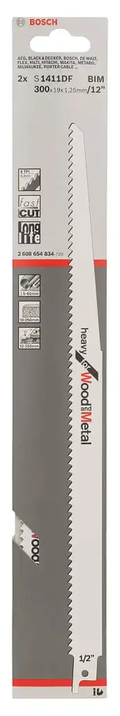 Шабельне полотно Bosch S 1411 DF Heavy for Wood and Metal довжиною 300 мм з фрезерованими, розведеними зубами з кроком 4,3 мм / 6 TPI, універсальним хвостовиком. Виготовлене з біметалу, полотно відрізняється поєднанням таких якостей як твердість і в'язкопружність. Легко розпилює лісоматеріали, у тому числі з цвяхами, деревні плити, ДСП товщиною до до 250 мм, склопластик і епоксидні матеріали — 60 мм.