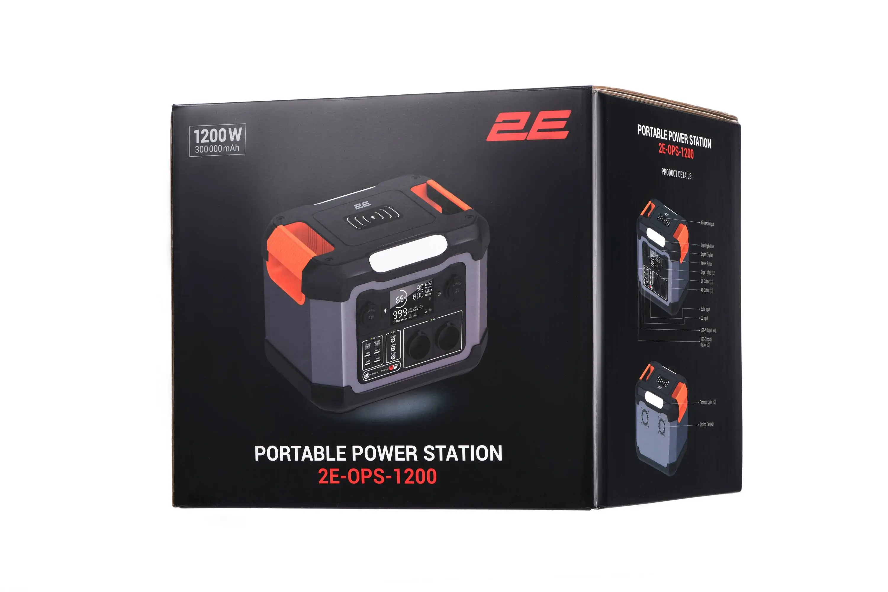 Компактна портативна електростанція стане чудовим рішенням за умов відсутності загальної мережі електроенергії. Пристрій, по суті, є великою батареєю в захисній коробці з вбудованими розетками змінного струму та іншими портами. Попри порівняно відчутну вагу (11,6 кг), ця модель має ергономічну форму й доволі компактні габарити. 2E-OPS-1200 оснащено ємним (300 000 мА·год) літієвим акумулятором, заявлена потужність – 1 200 Вт, а частота – 50 Гц. Електростанція надає додаткові можливості, як-то бездротове заряджання чи LED-освітлення.
