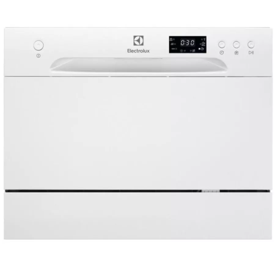Окремо розташована посудомийна машина Electrolux ESF2400OW співслужить хорошу службу в кожному будинку, де проживають дуже зайняті люди, у яких кожна хвилина на рахунку. Модель представлена в білому корпусі габаритами 43,8x55x50 см, оснащується дверцятами, які легко і плавно відчиняються/зачиняються, та електронною панеллю управління з дисплеєм. Вона розрахована на завантаження 6 стандартних комплектів посуду, пропонує майбутнім користувачам на вибір 6 програм з 4 температурними режимами. Залежно від завдань і ступеня забруднення можна скористатися найбільш підходящими з них. Клас енергетичної ефективності Electrolux ESF2400OW - A+. Це гарантує помірні рахунки в майбутніх комунальних платіжках. Серед іншого не можна не відзначити відображення залишкового часу, присутність індикаторів наявності солі та ополіскувача, функцію попереднього полоскання.