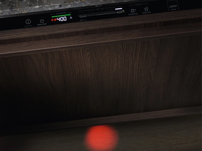 Система підсвітки Beam on Floor зберігає тишу на вашій кухні. Замість гучного сигналу, який може бути заглушений стороннім шумом, наша посудомийна машина чітко повідомляє вас про процес роботи, проектуючи крапку на підлогу. Червоного кольору, коли машина працює, та зеленого, коли вона закінчила роботу.