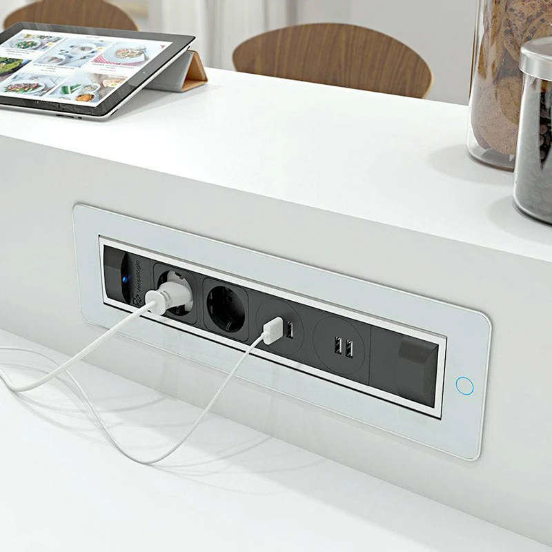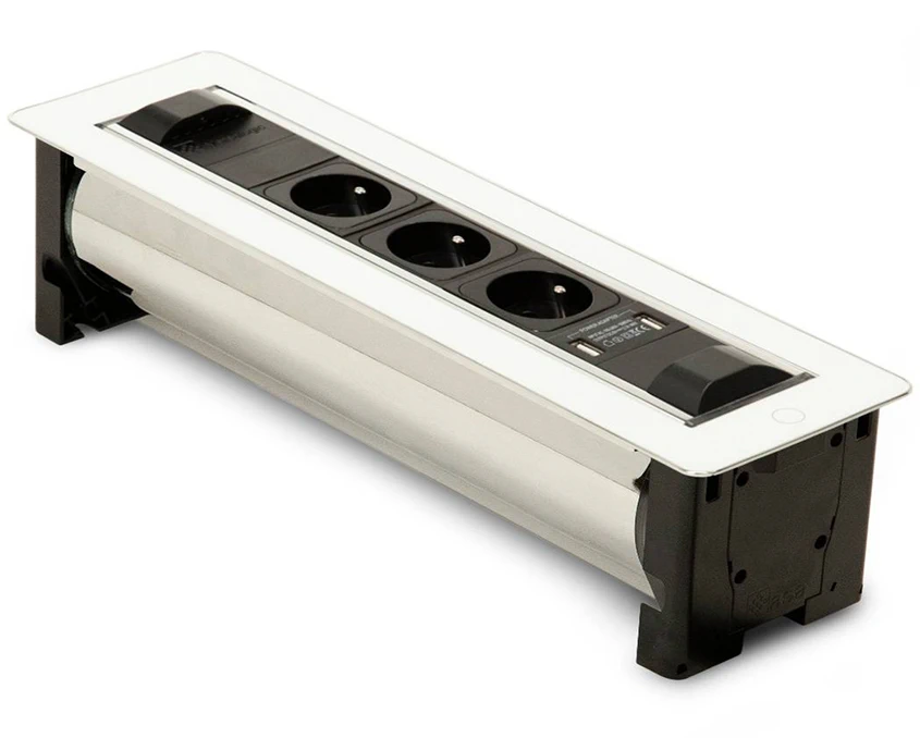 Поворотный блок розеток ASA позволяет эффективно использовать пространство на рабочем столе, поскольку занимает минимум места и может быть легко скрыт, когда не используется. Такой блок розеток совместим с различными электроприборами благодаря наличию различных типов розеток.