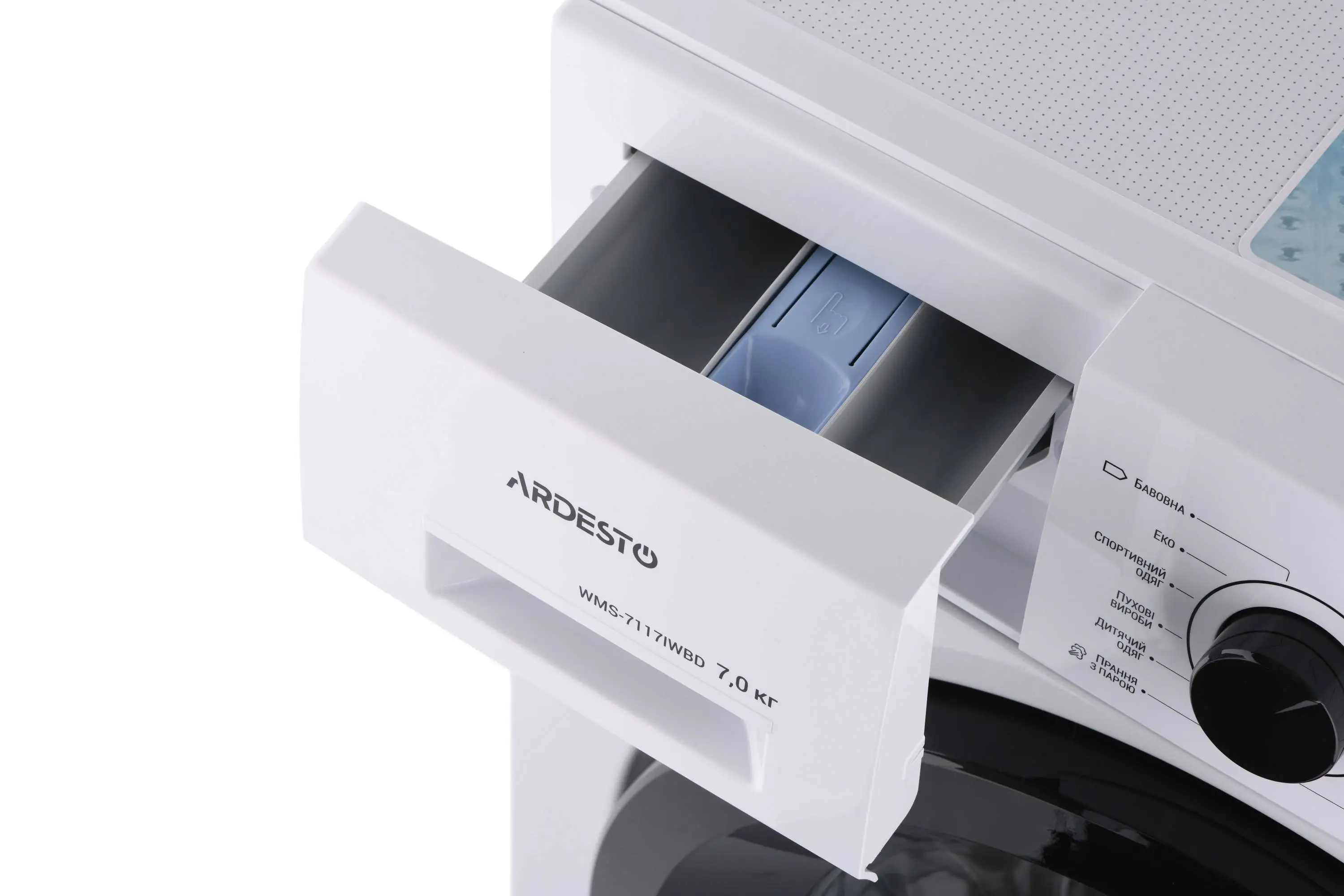 Автоматична пральна машина в корпусі білого кольору з фронтальним завантаженням. Пристрій може випрати та віджати 7 кг білизни. Пральна машина оснащена тихим і потужним інверторним двигуном BLDC. Максимальна швидкість обертання барабана – 1 400 об/хв., максимальна потужність – 1 750 Вт. Клас енергоефективності А+++, клас водостійкості ІРХ4, клас захисту I.