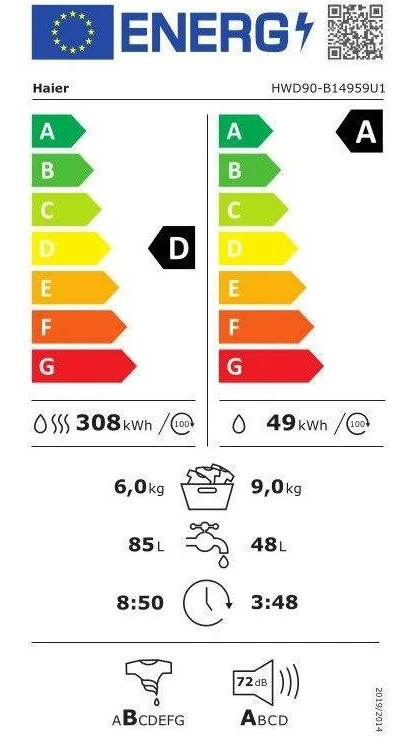 Прально-сушильна машина Haier фронтальна, 9(6)кг, 1400, A, 60см, дисплей, пара, інвертор, люк чорний