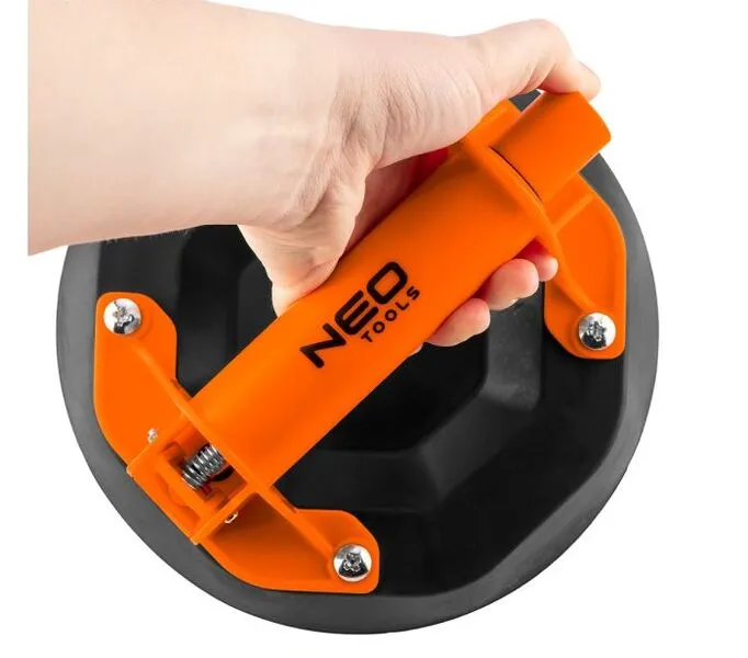 Вакуумна присоска NEO з насосом (арт 56-800) призначена для плитки та скла. Максимальна вантажопідйомність - 160 кг. Вона оснащена вакуумним насосом для більш міцного захоплення та кнопкою для його швидкого розблокування.  Присоска також може використовуватися для видалення вм'ятин на кузовах автомобілів. Це універсальний інструмент, який дозволяє безпечно транспортувати та встановлювати вікна, черепицю тощо. Виріб упаковано в чохол для перенесення.