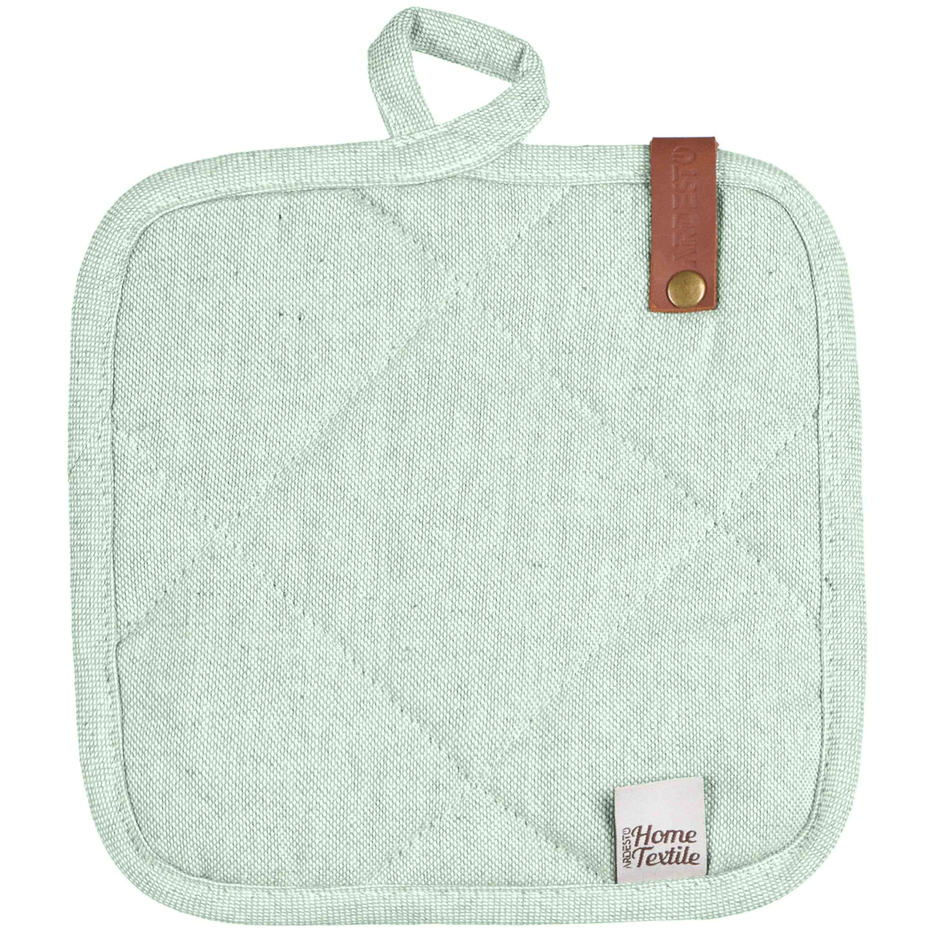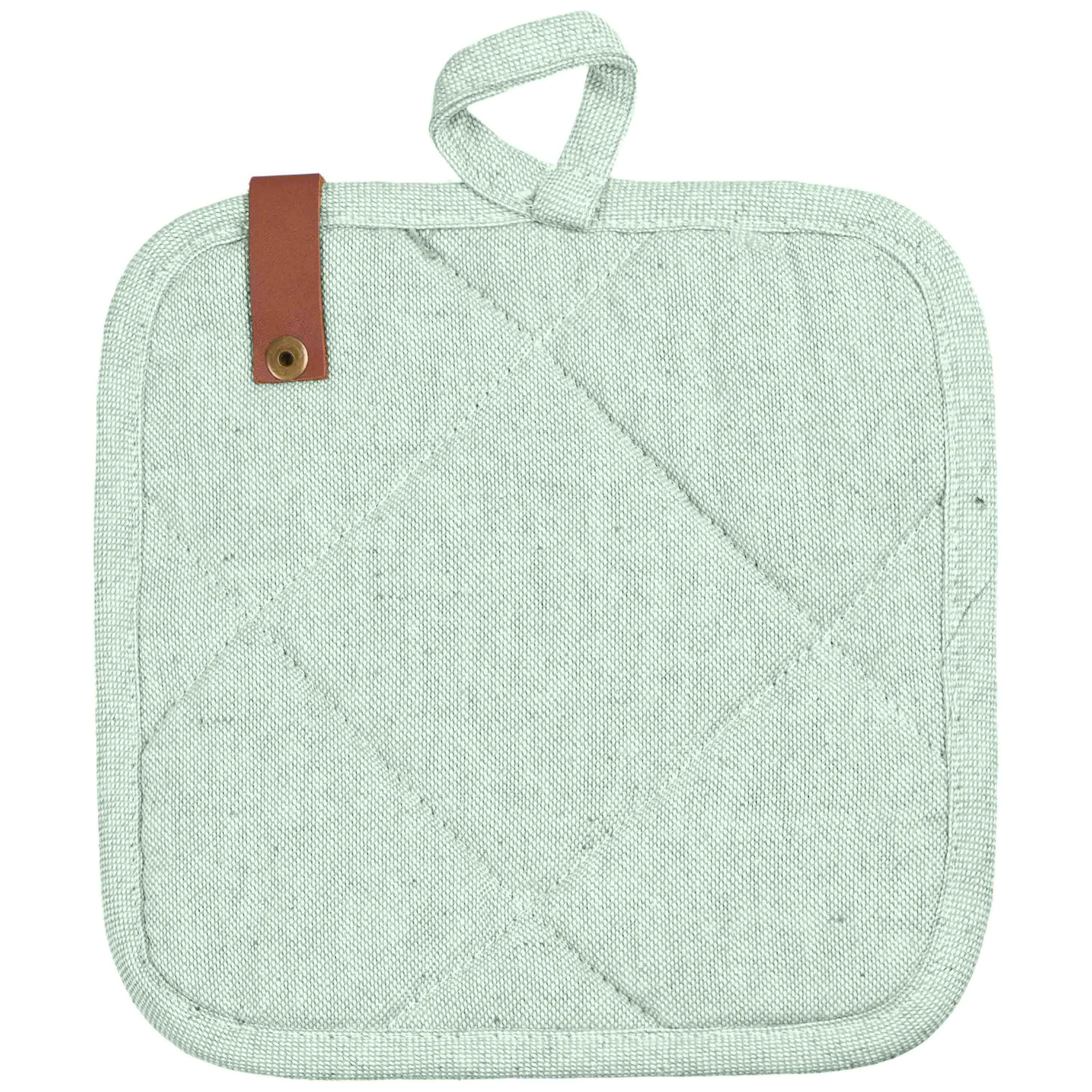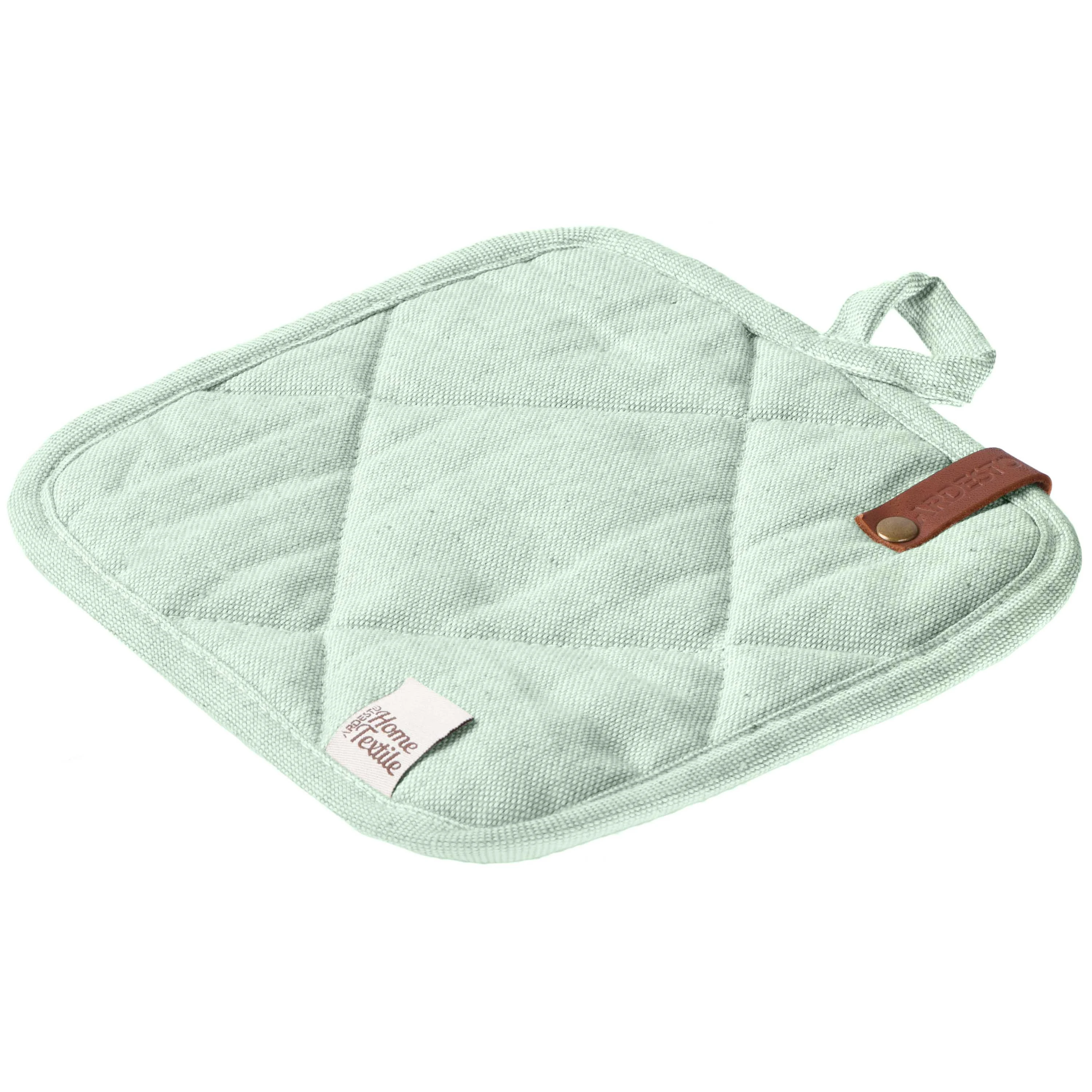 Стильна та практична прихватка, виконана в кольорі аквамарин, стане незамінним помічником на кухні. Вироблена з якісної 100 % бавовни, має розмір 20 × 20 см, що зумовлює універсальність і зручність використання. Наповнювач із ватину забезпечує захист від опіків. Для збереження первинного вигляду прихватки варто дотримуватися рекомендацій щодо догляду: прати в машині за делікатного режиму (30 °C); не сушити в сушильній машині, а тільки у вертикальному положенні; прасувати за температури до 150 °C; також заборонено відбілювання та хімчистка.