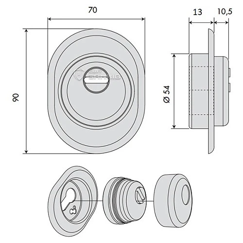 Для монтажу по діаметру протектора робиться отвір в дверному полотні. Кріпиться довкола серцевини стяжними гвинтами, створюючи монолітну конструкцію з нею. Таким чином, протектор захищає її разом із точкою кріплення в дверях від фізичних та силових методів злому — свердління, виламування та вибивання. Доступу до гвинтів кріплення немає і зірвати саму броненакладку надзвичайно складно. Висота (або товщина) врізної частини складає 13 мм (+10,5 мм зовнішньої), діаметр - 54 мм. Комплектується овальним кожухом зі сталі із зовнішнім розміром 70х90 мм.
