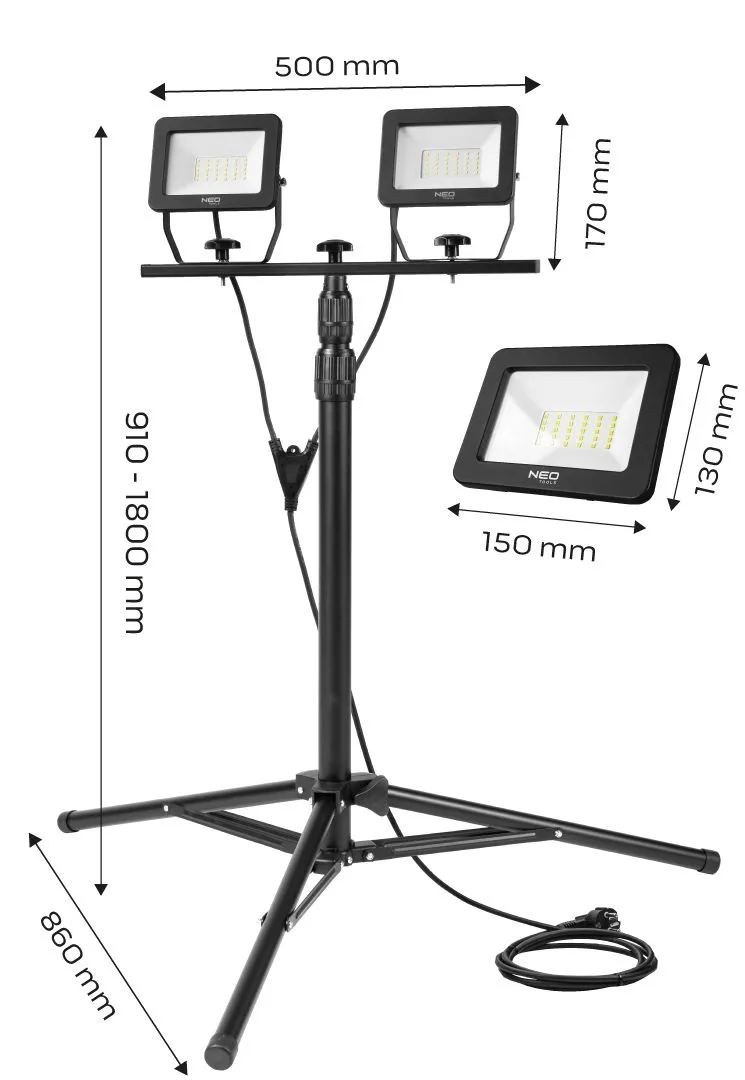 Прожектор Neo Tools, 220В, 5400лм, 2х30Вт, кабель 3м з вилкою, на штативі 1.8м, алюміній, IP65