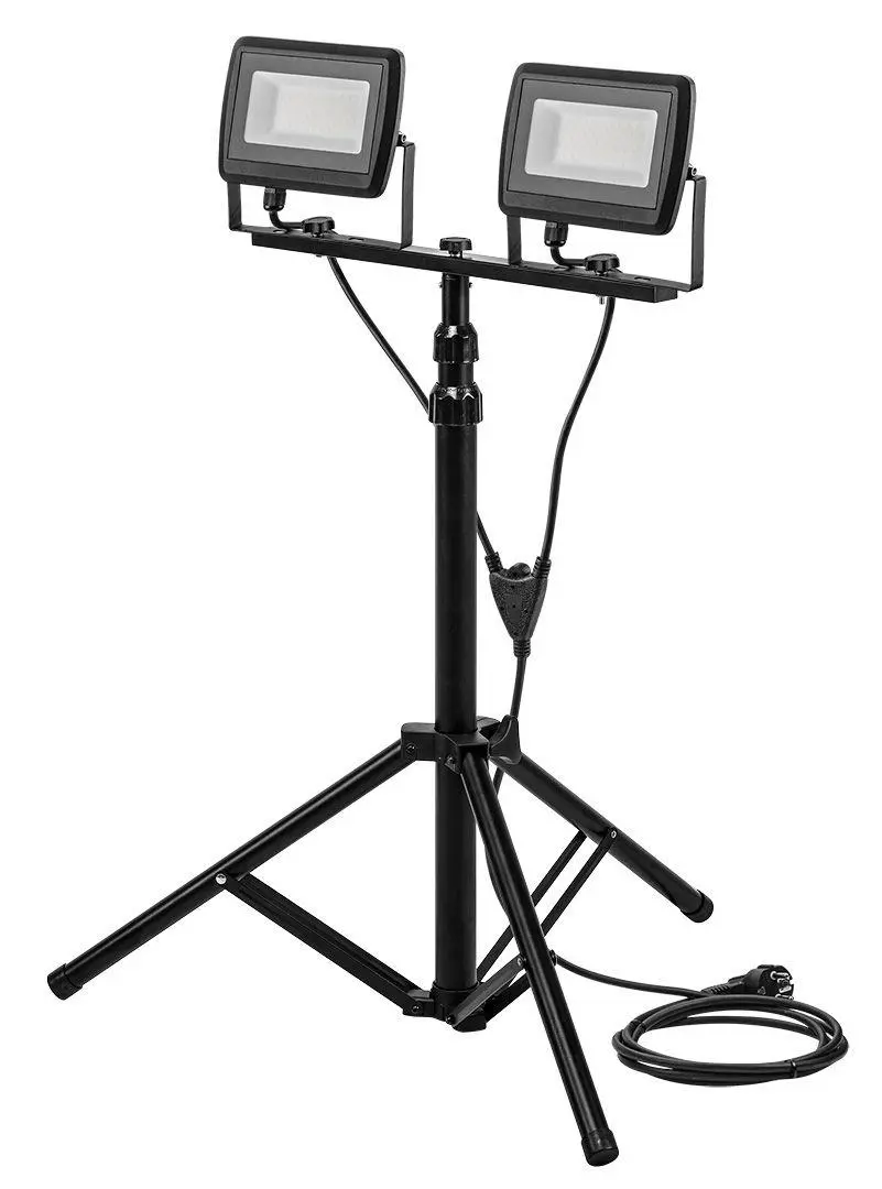 Подвійний прожектор на тринозі Neo Tools 99-062 оснащений світлодіодами SMD потужністю 2x50 Вт та світловим потоком 8500 люмен. Він призначений для використання під час ремонтних та будівельних робіт, а також у майстерні чи фотостудії. І при цьому може також використовуватися і в інших приміщеннях і для інших цілей (підсвітити майданчик, у дворі необхідну ділянку і т.п.).