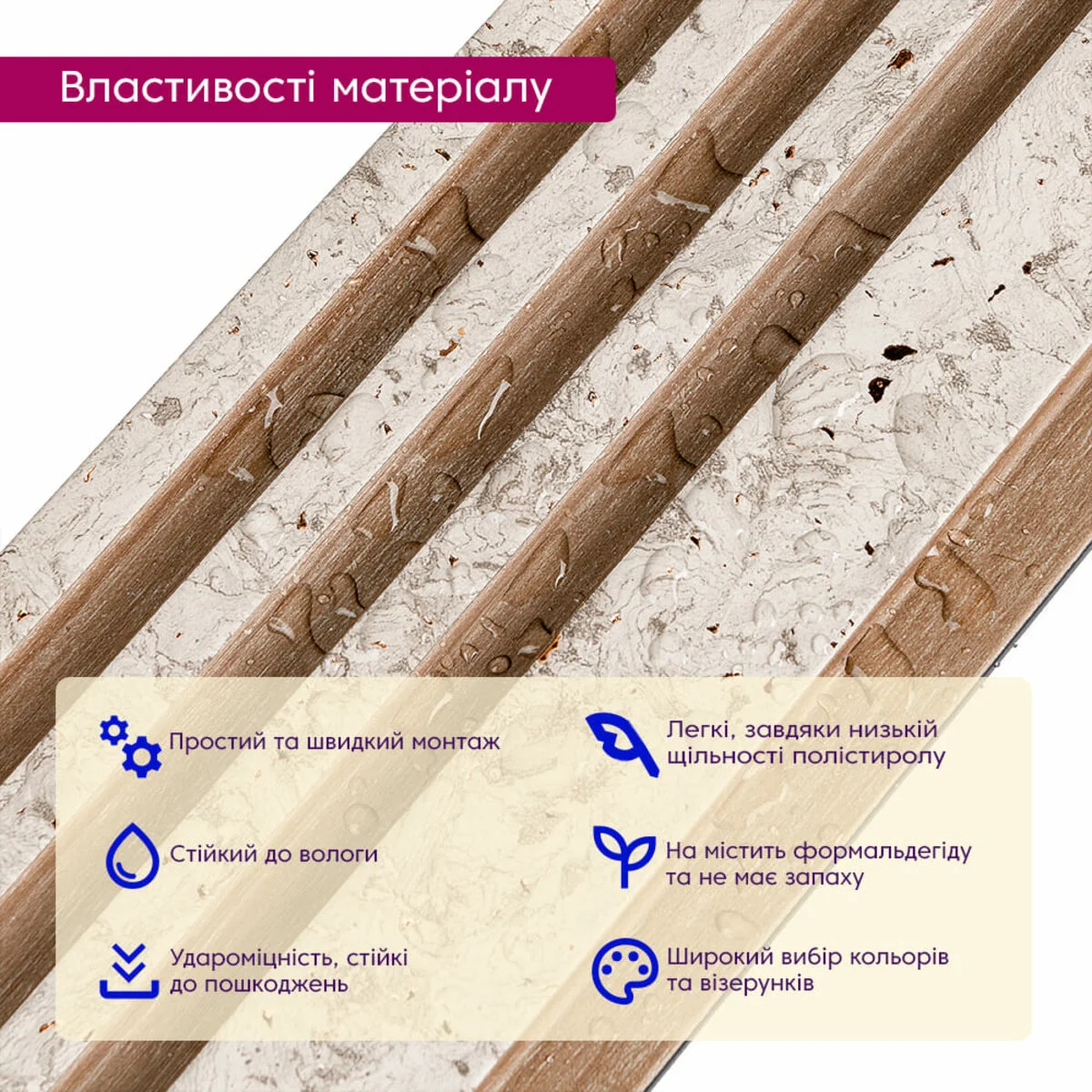 - Безпека: Матеріали не містять формальдегіду і не мають запаху.
