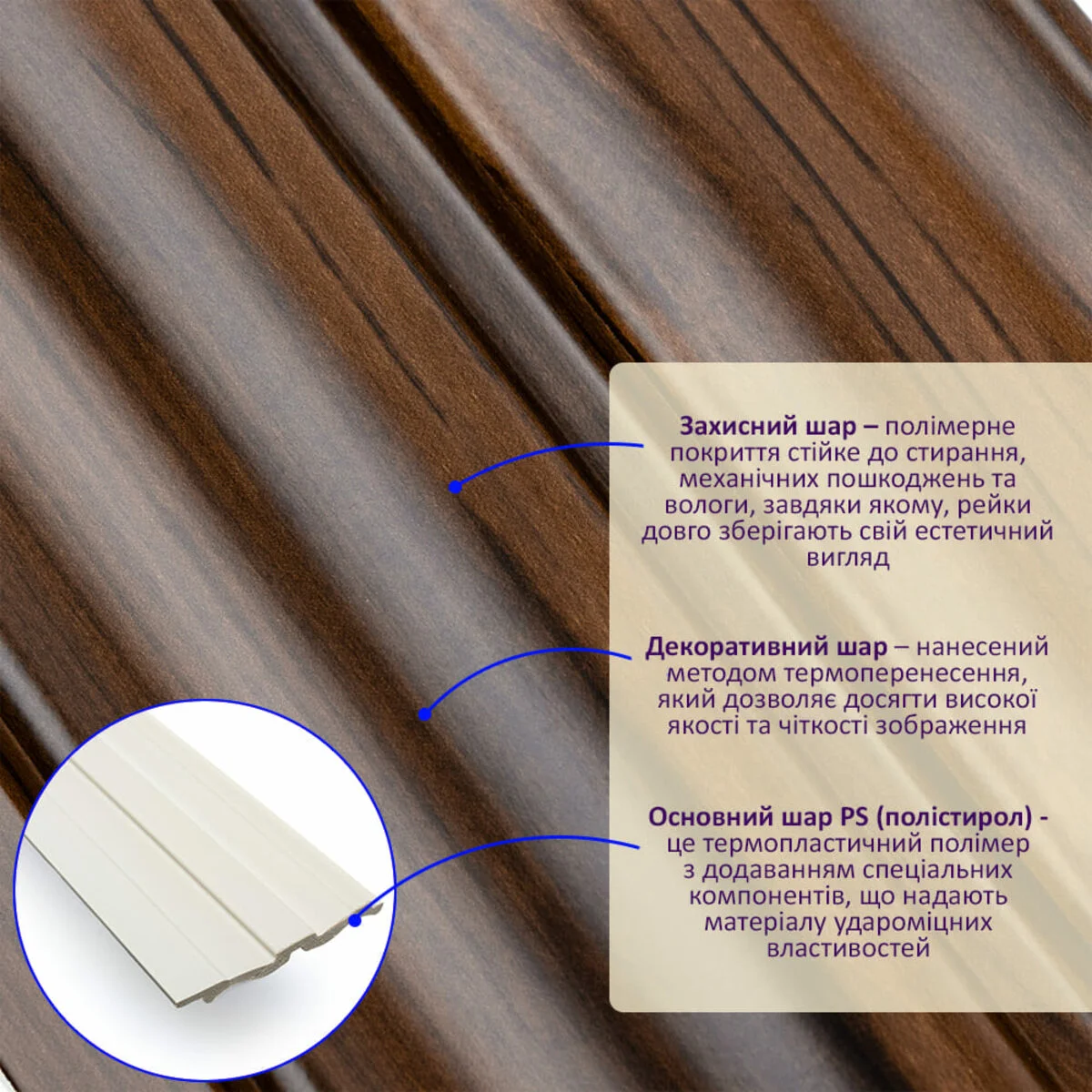 - Защитный слой – полимерное покрытие, устойчивое к истиранию, механическим повреждениям и влаге, благодаря которому рейки долго сохраняют свой эстетичный вид.