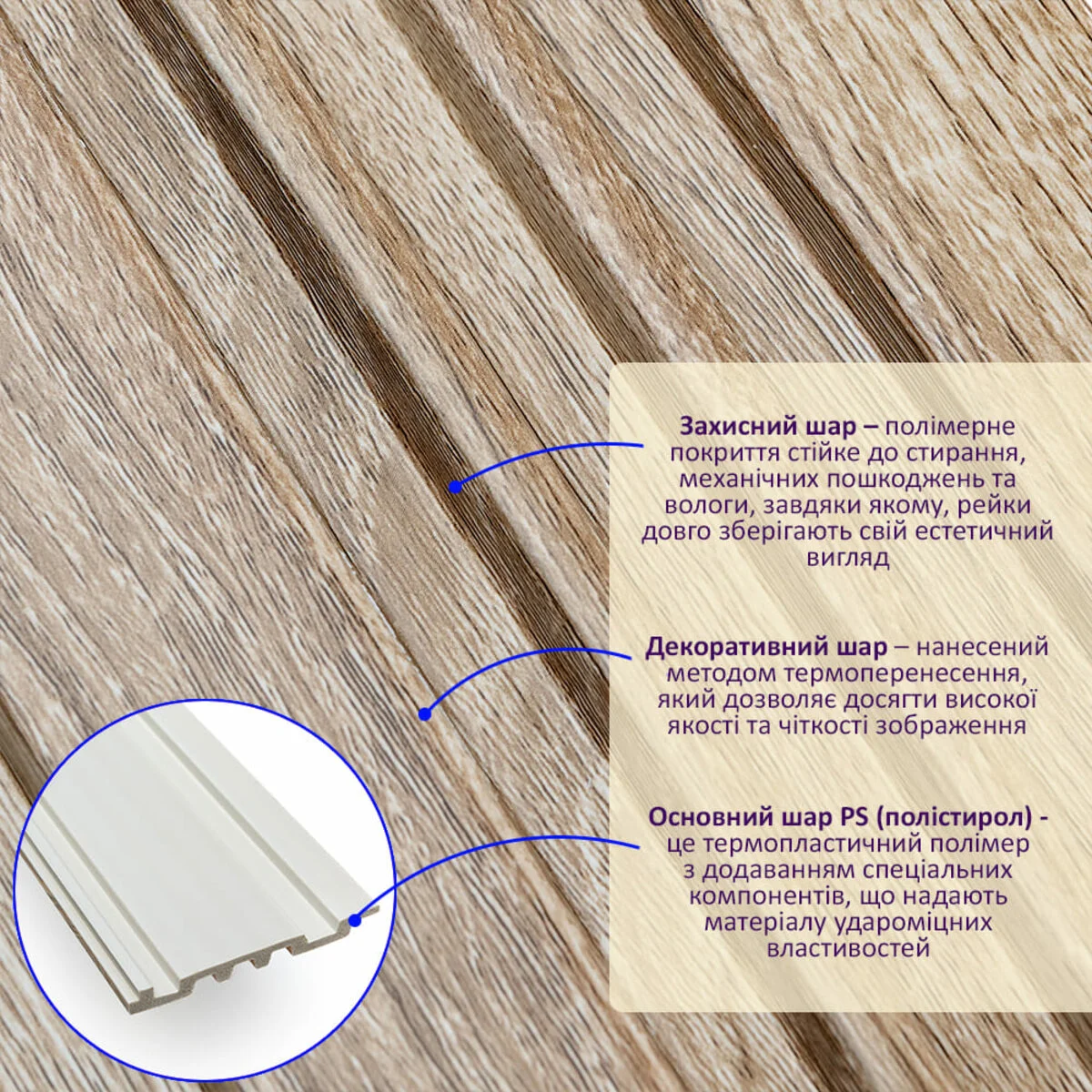 - Защитный слой – полимерное покрытие, устойчивое к истиранию, механическим повреждениям и влаге, благодаря которому рейки долго сохраняют свой эстетичный вид.