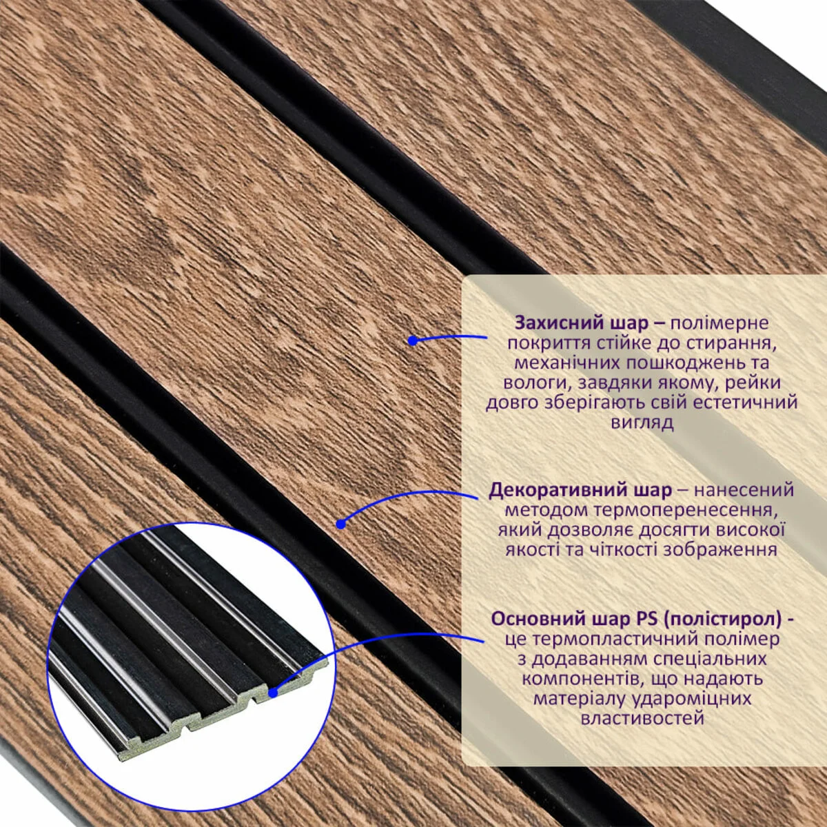 - Защитный слой – полимерное покрытие, устойчивое к истиранию, механическим повреждениям и влаге, благодаря которому рейки долго сохраняют свой эстетичный вид.