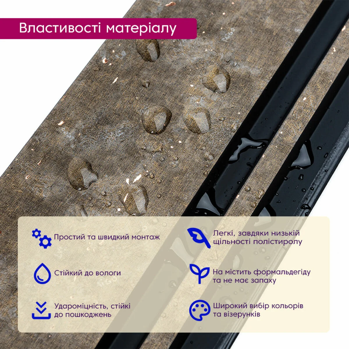 - Водостійкість: Захисне полімерне покриття та основний шар із PS не поглинають вологу.