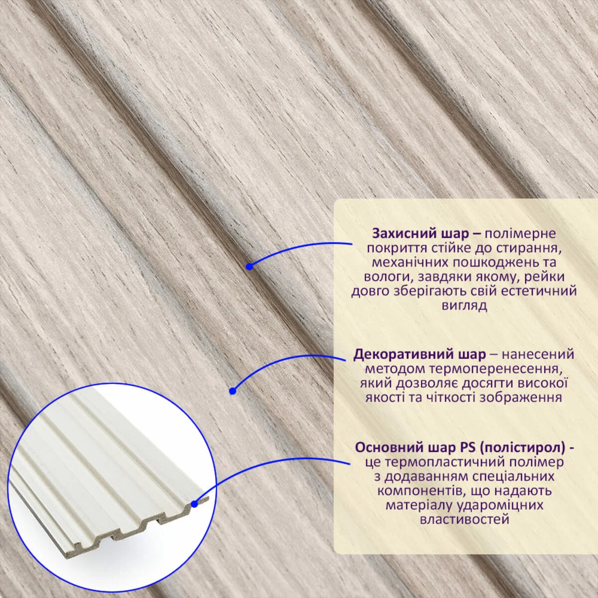 - Защитный слой – полимерное покрытие, устойчивое к истиранию, механическим повреждениям и влаге, благодаря которому рейки долго сохраняют свой эстетичный вид.