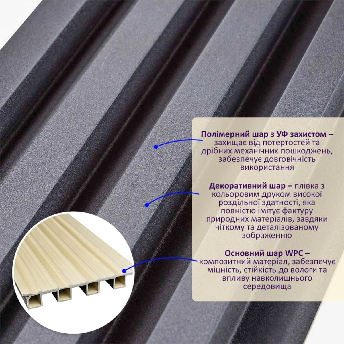 Полимерный слой, защищающий от потертостей и мелких механических повреждений, обеспечивает долговечность использования, а УФ-защита помогает предотвратить выгорание, сохраняя цвет декоративного слоя насыщенным, за счет чего рейка долго сохраняет свой первоначальный эстетический вид.