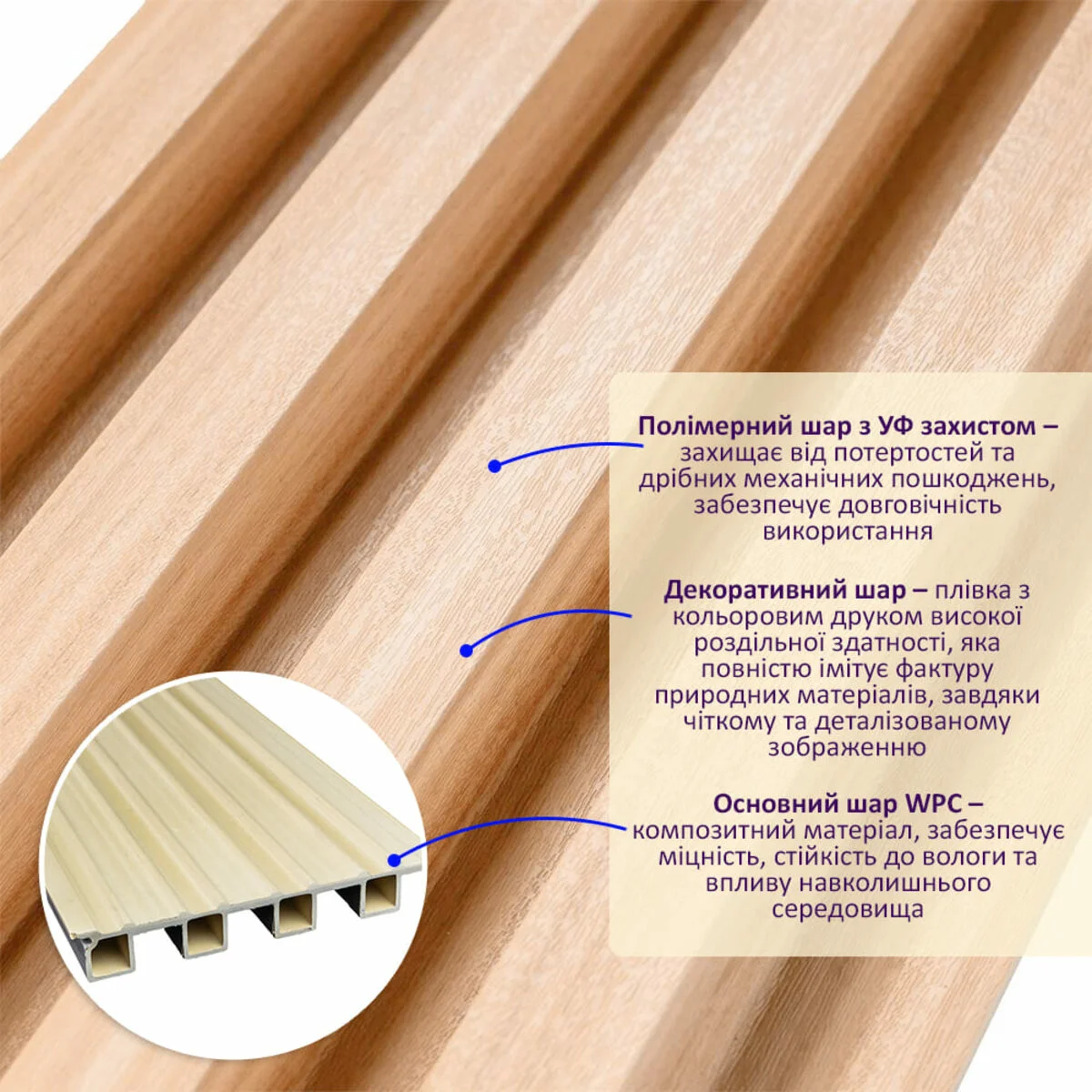 • Полимерный слой, защищающий от потертостей и мелких механических повреждений, обеспечивает долговечность использования, а УФ-защита помогает предотвратить выгорание, сохраняя цвет декоративного слоя насыщенным, за счет чего рейка долго сохраняет свой первоначальный эстетический вид.