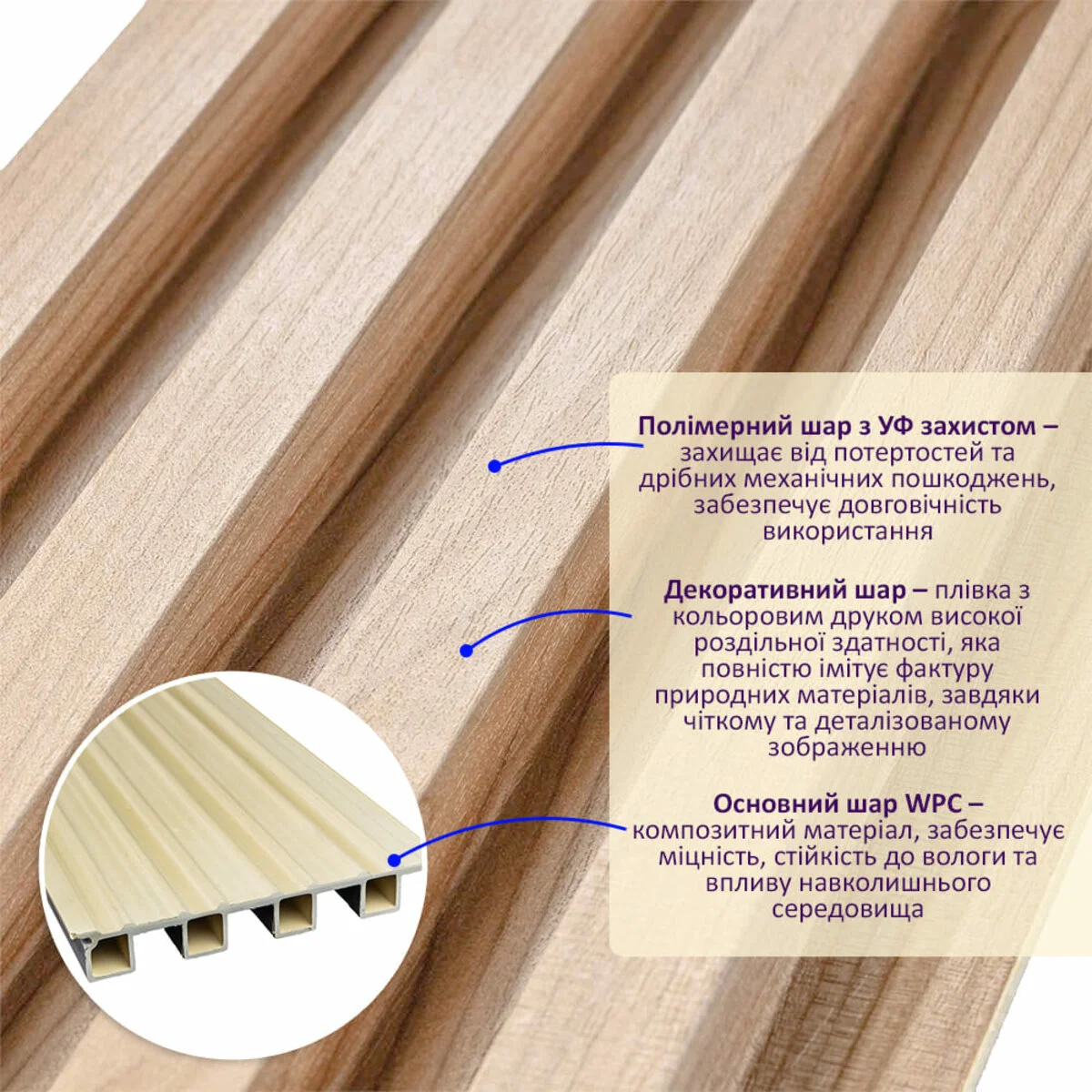 • Основний шар WPC: є композитним матеріалом, який поєднує в собі деревні волокна (або стружку) з полімерними матеріалами, що забезпечує матеріалу міцність, стійкість до вологи і стійкість до впливу зовнішнього середовища.