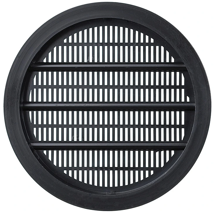 Вентиляційна решітка, кругла, з захисною кромкою, з особливо вузькою перфорацією (від комах), матеріал: пластмаса, колір: чорний, діаметр з кромкою 65 мм, діаметр без кромки 60 мм, товщина кромки 2 мм, глибина решітки 7 мм, площа проходу 8 см², для монтажу шляхом врізання, кріплення цвяхами.