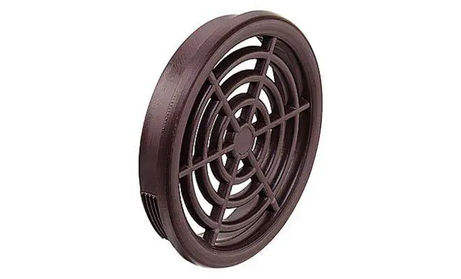 Вентиляційна решітка круглої форми з прорізями, гарпунною перемичкою та захисною кромкою. Вентиляційна решітка виготовлена з пластмаси коричневого кольору. Діаметр решітки з урахуванням кромки 48 мм, без кромки 44 мм, глибина решітки 7 мм, товщина кромки 3 мм. Монтаж решітки виконується шляхом врізання.