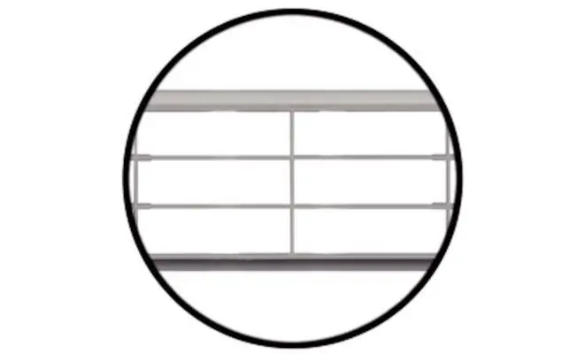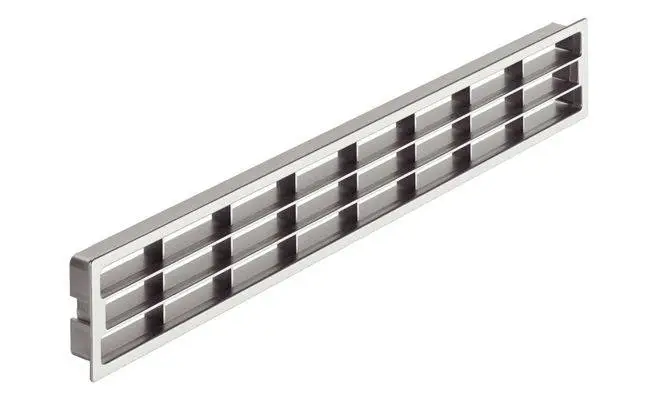 Прямокутна вентиляційна решітка з ламелями, захисною кромкою та фіксуючими зажимами. Вентиляційна решітка виготовлена з пластмаси сріблястого кольору з матовою поверхнею. Решітка призначена для товщини деталі 10-20 мм, ширина решітки з урахуванням захисної кромки 65 мм, без кромки 55 мм, довжина решітки з кромкою 458 мм, довжина без кромки 448 мм, глибина решітки 20 мм, площа проходу більше 200 см². Монтаж решітки виконується шляхом врізання, кріплення ззаду за допомогою фіксуючих зажимів.