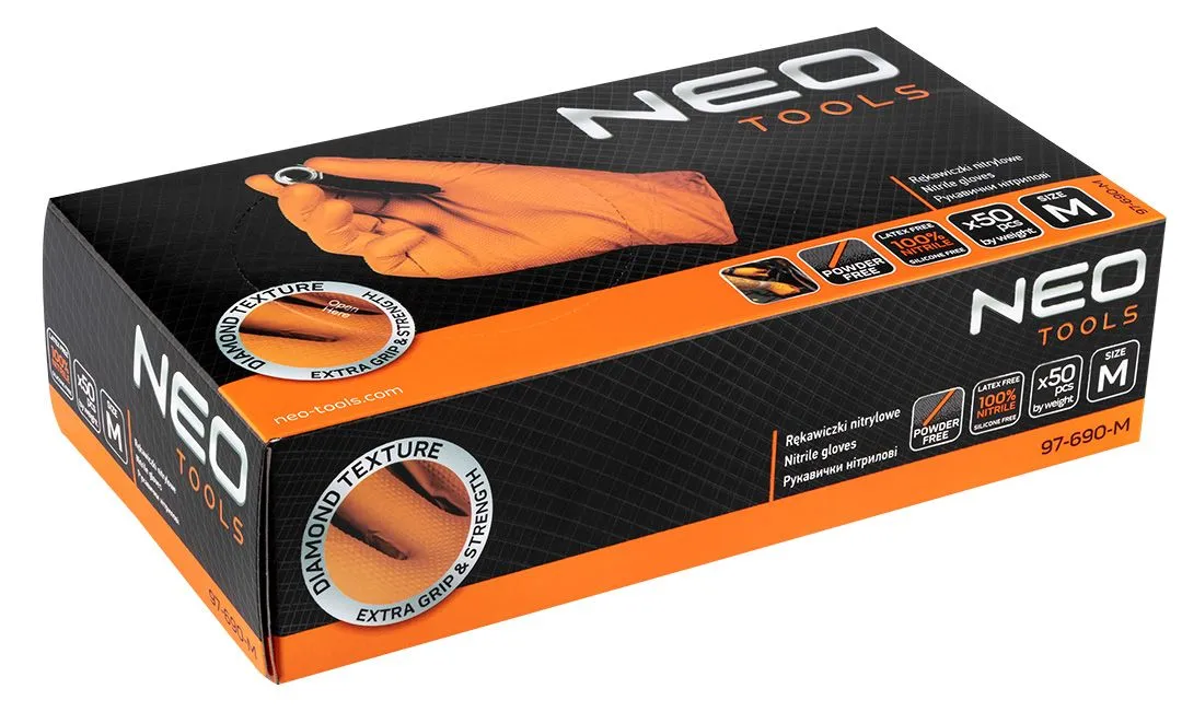 Перфоровані нітрилові рукавички, помаранчеві, 50 штук, розмір M, 97-690-M від NEO - це рукавички, виготовлені з міцнішого матеріалу, ніж звичайний нітрил, що надає їм більшої стійкості до проколів або розривів у суворих умовах. Текстурована алмазна поверхня відводить рідини і забезпечує найкраще захоплення. Рукавички знижують навантаження на руку та підвищують безпеку користувача. Вони містять порошку, що рекомендується для алергіків. Ця модель також відрізняється двосторонністю, тому рукавички ідеально сидять на обох руках, що робить їх більш швидким та легким вдяганням.