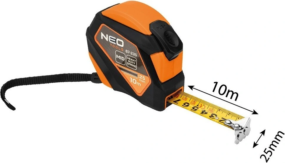 Рулетка сталева 10 м х 25 мм, автоблокування, кнопка стоп, магніт 67-235 від NEO TOOLS - це інструмент з рулеткою довжиною 10 м і шириною 25 мм. Оснащений практичною функцією автоматичної зупинки, яка запобігає самостійному втягуванню рулетки в розгорнутому стані, а також можливістю використання фіксуючого пристрою. Магніт сприяє кращій стабілізації рулетки, а збільшений друк впливає на швидкість зчитування результатів вимірювань.