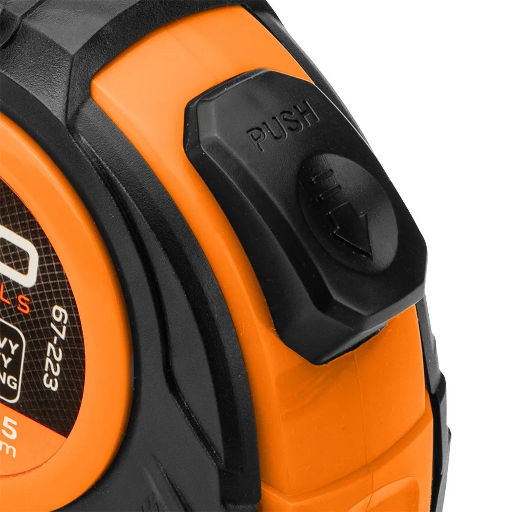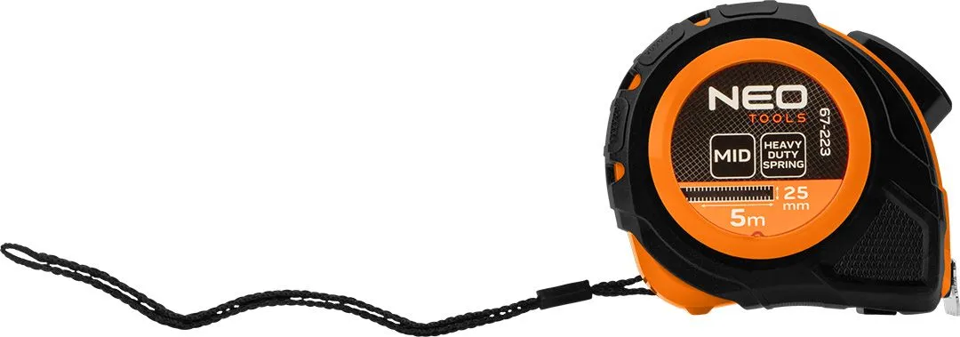 Рулетка сталева 5 м х 25 мм, автоматичний стопор, дві кнопки зупинки 67-223 від NEO TOOLS - це інструмент з довжиною 5 м і шириною 25 мм. Оснащена практичною функцією автоматичної зупинки, яка запобігає самостійному втягуванню рулетки в розгорнутому стані, а також можливістю використання двох кнопок фіксації.