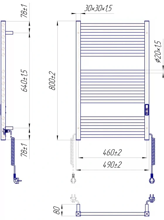 Електросушарка для рушників побутова Гера-I 800х500/80 TR К. Обладнана таймер-регулятором та конектором для підключення в розетку з будь-якого боку. Сумісна з комплектом прихованого підключення. Має 16 ребер та стояки з профільної труби.