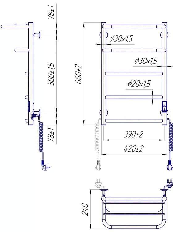 Електросушарка для рушників побутова Hotel-І 650х430/240 TR К. Обладнана таймер-регулятором та конектором для підключення в розетку з будь-якого боку. Сумісна з комплектом прихованого підключення. Має 5 ребер та стояки з круглої труби.