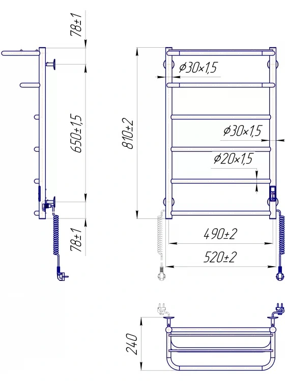 Електросушарка для рушників побутова Hotel-І 800х530/240 TR К. Обладнана таймер-регулятором та конектором для підключення в розетку з будь-якого боку. Сумісна з комплектом прихованого підключення. Має 6 ребер та стояки з круглої труби.
