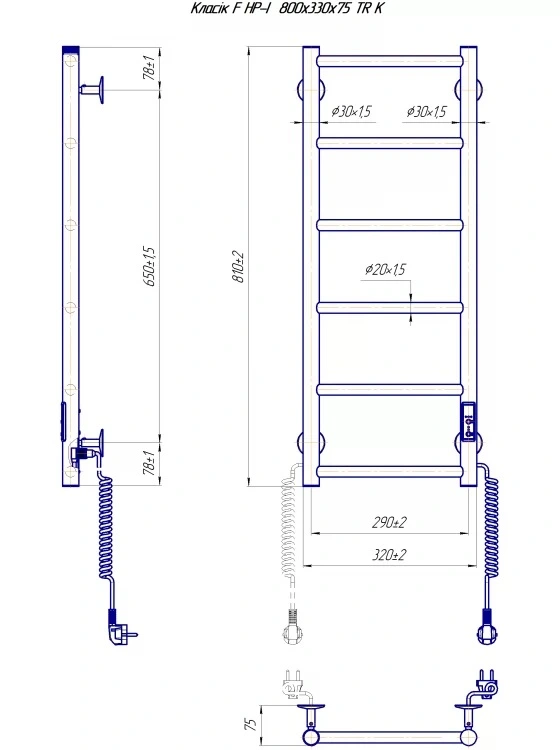 Електросушарка для рушників побутова Класік F НР-I 800х330/75 TR K. Обладнана таймер-регулятором та конектором для підключення в розетку з будь-якого боку. Сумісна з комплектом прихованого підключення. Має 6 ребер та стояки з круглої труби.